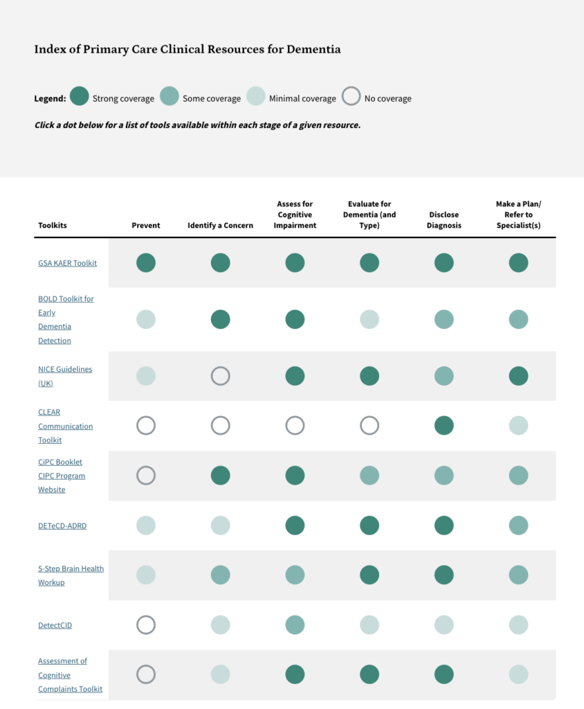 The Index is not intended to be a comprehensive catalog; rather, it’s meant to serve as a starting point for clinicians trying to quickly find something that will help them in the moment, whether that’s suggested language for starting a conversation or detailed information about evaluating patients for different types of dementia. The toolkit intentionally does not evaluate the quality or utility of each toolkit so that each clinician can decide what’s most useful for their specific needs.