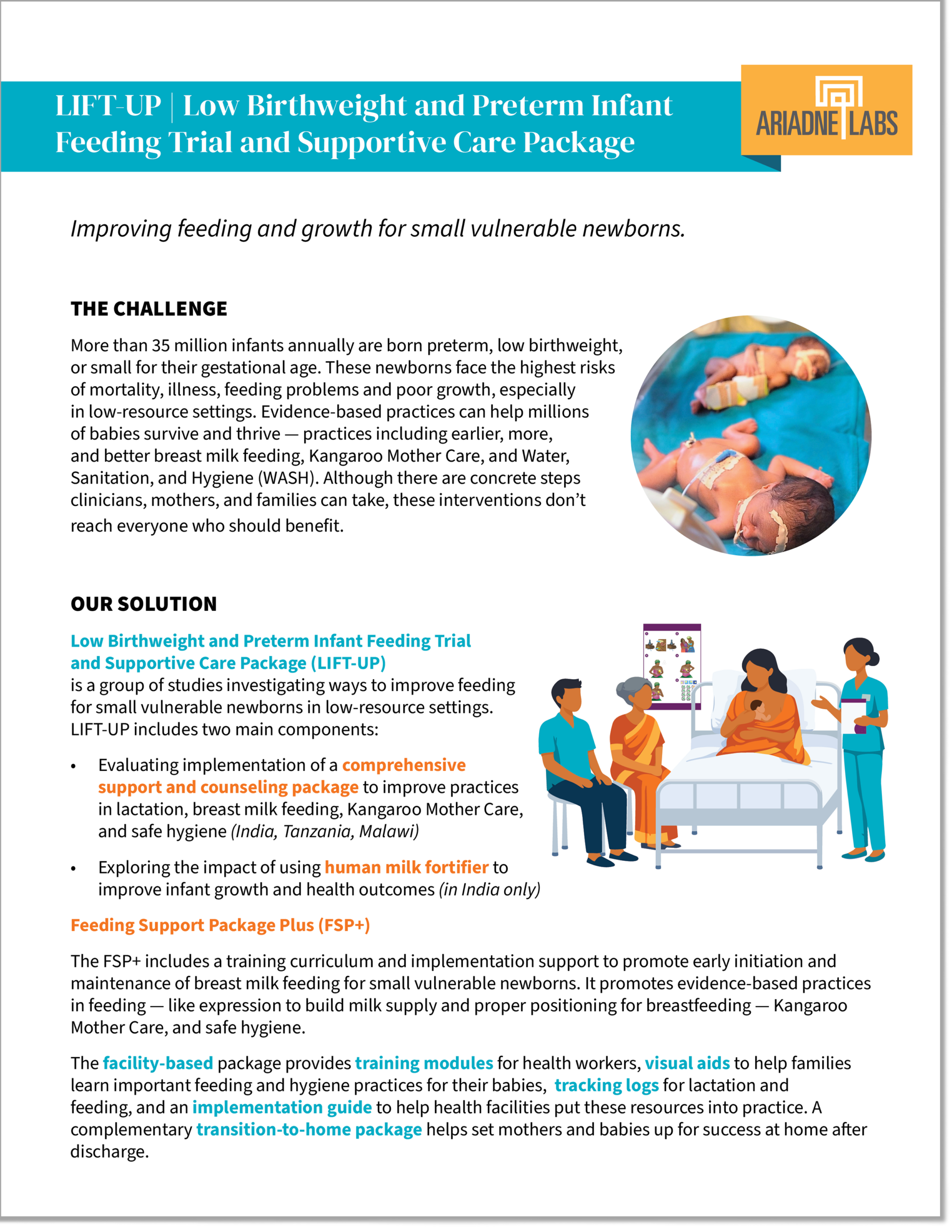 LIFT-UP is a group of studies investigating ways to improve feeding for small vulnerable newborns in low-resource settings. These infants — born preterm, low birthweight, or small for their gestational age — account for 55.3% of global neonatal deaths. Although there are concrete steps clinicians, mothers, and families can take to care for these infants, these interventions don’t reach everyone who should benefit.