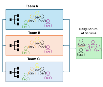The accelerator will use the Scrum framework (Figure 1) for agile product development – and with participation from a number of hospitals will leverage the Scrum at Scale model (Figure 2) to allow for parallel sprints – or products to be worked on simultaneously. This model will allow for mixed teams from different hospitals working toward the same goal with oversight and support to alleviate impediments from an Ariadne Labs based scrum master and scrum of scrum master. In addition to the role of scrum master, Ariadne Labs would provide product owners for these teams to provide guidance and leadership to better understand the product’s end goal.